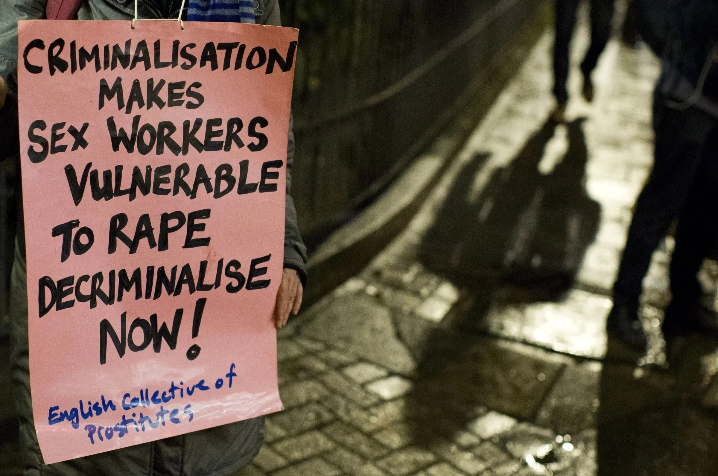 A person holding a pink protest sign. The sign reads: “Criminalisation makes sex workers vulnerable to rape — decriminalise now!” At the bottom, it is signed by the “English Collective of Prostitutes. The message suggests that when sex work is criminalized, people in that industry are pushed into unsafe conditions. Photo by Justin Tallis/AFP via Getty Images.