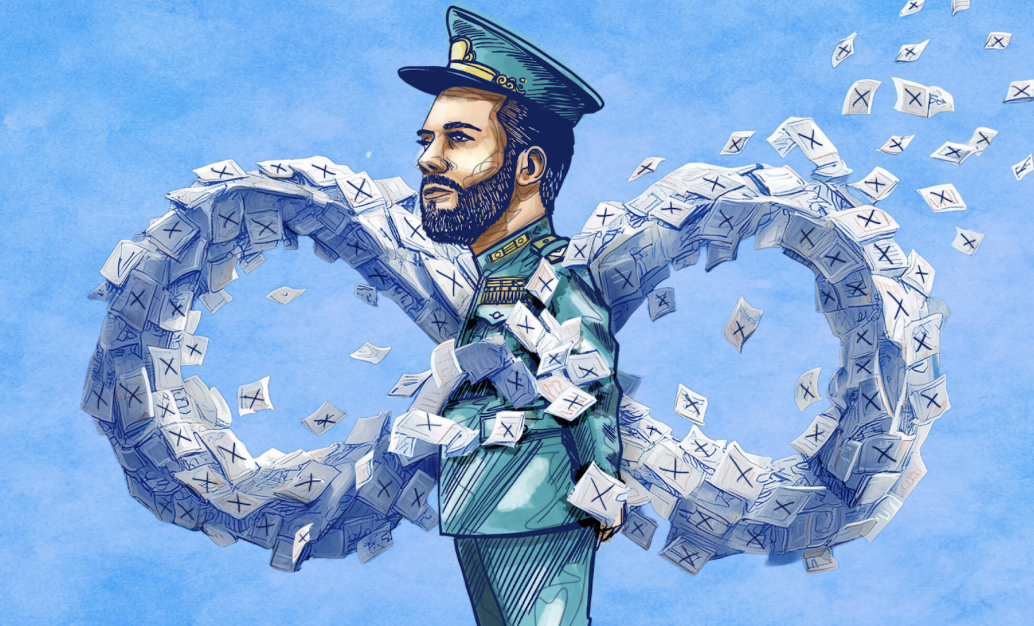 Nández, César. Illustration of Nayib Bukele with papers forming an infinity symbol. Latinoamérica21.